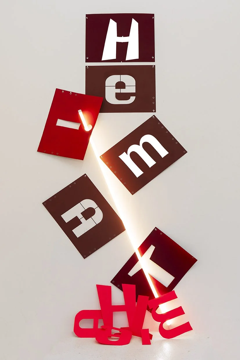 HEIMAT, 2024, Laser cut letters & stencils, Oil board & LED tube, 320 x 120 cm, Edition: 1/3