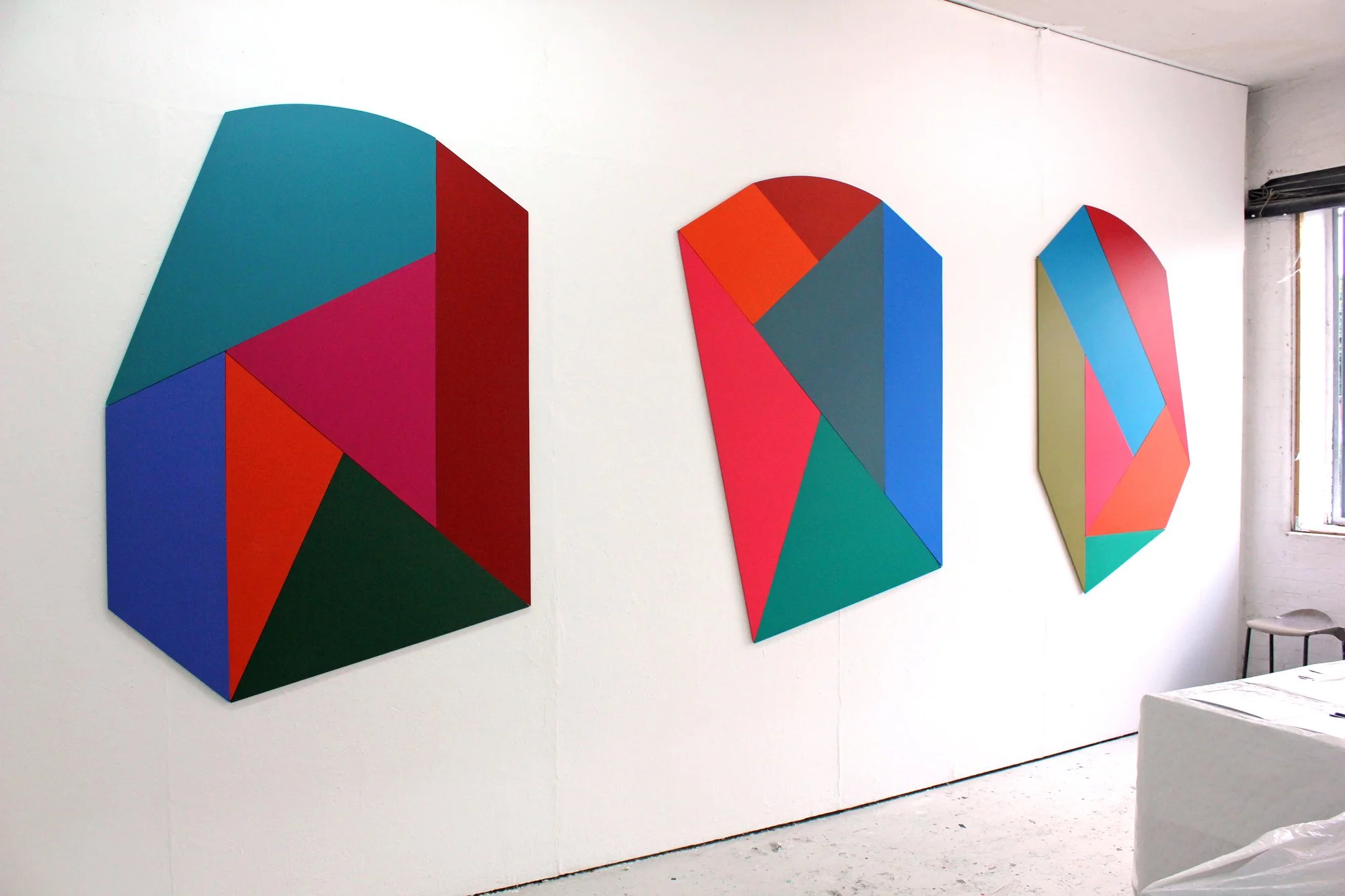 Showing 3 paintings constructed from panels of birchfaced plywood painted with acrylic paint each painting approx 180cm high